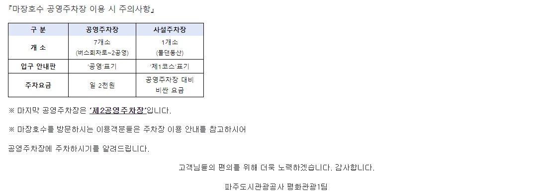 [파주·고양]마장호수 공영주차장 혼선에 따른 이용 안내
